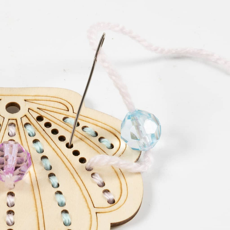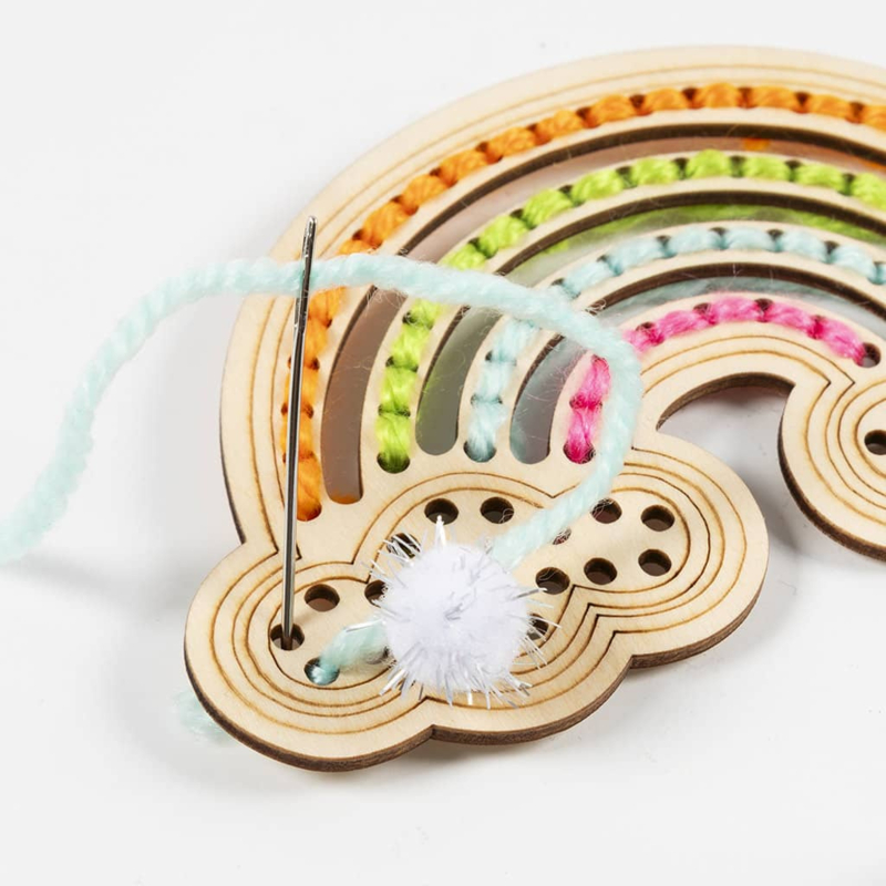 Kleur de Vlinder, Regenboog en Schelp met Multi Markers en versier ze verder met garen, pompons en kralen. Een leuke manier om kennis te maken met borduren.