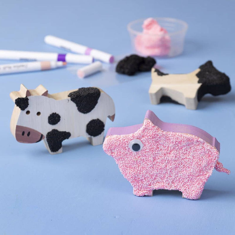 Een box vol dieren van licht hout om naar harte lust te versieren met Plus Color Acrylverf, Multi Markers, Foam Clay, Silk Clay en Glitter Clay.